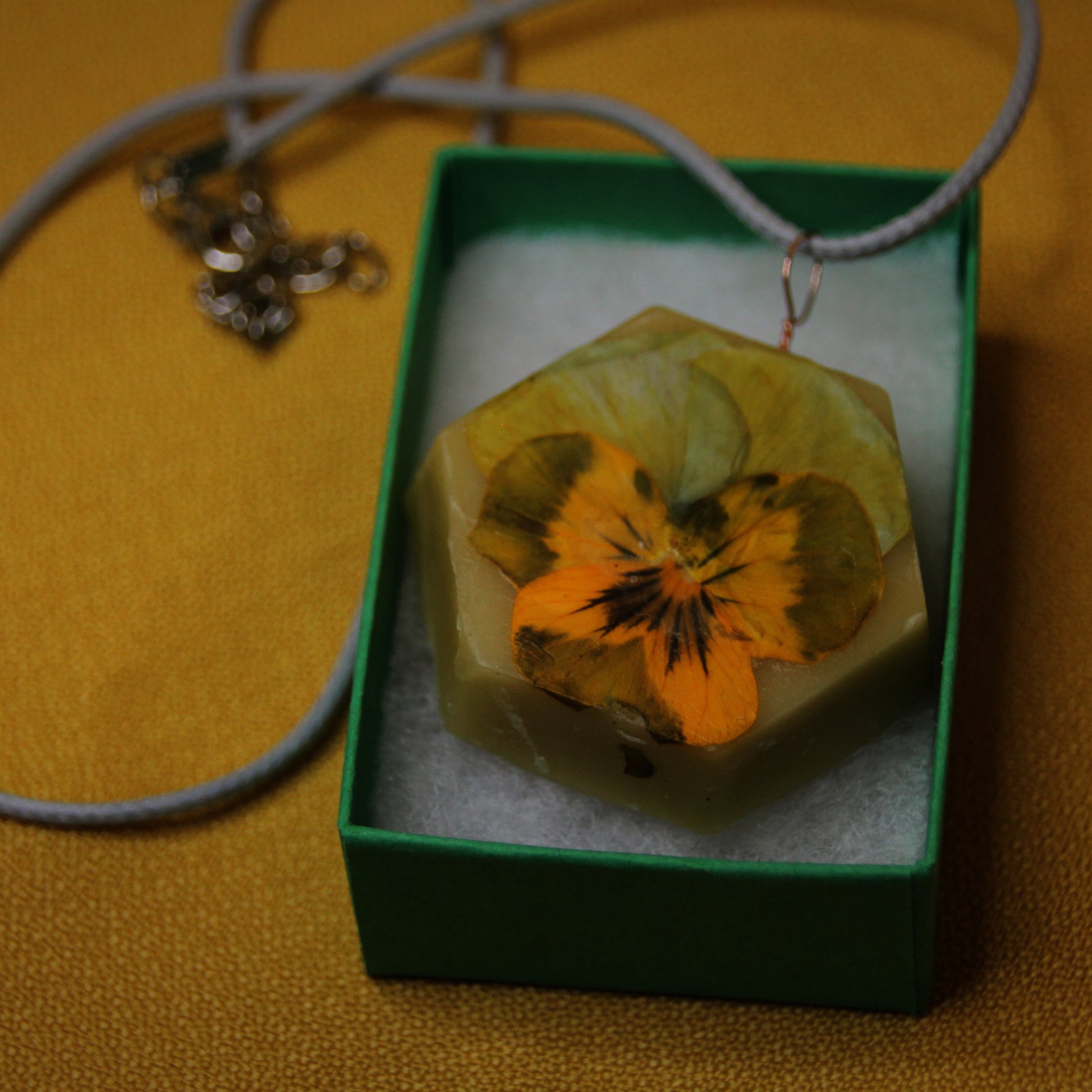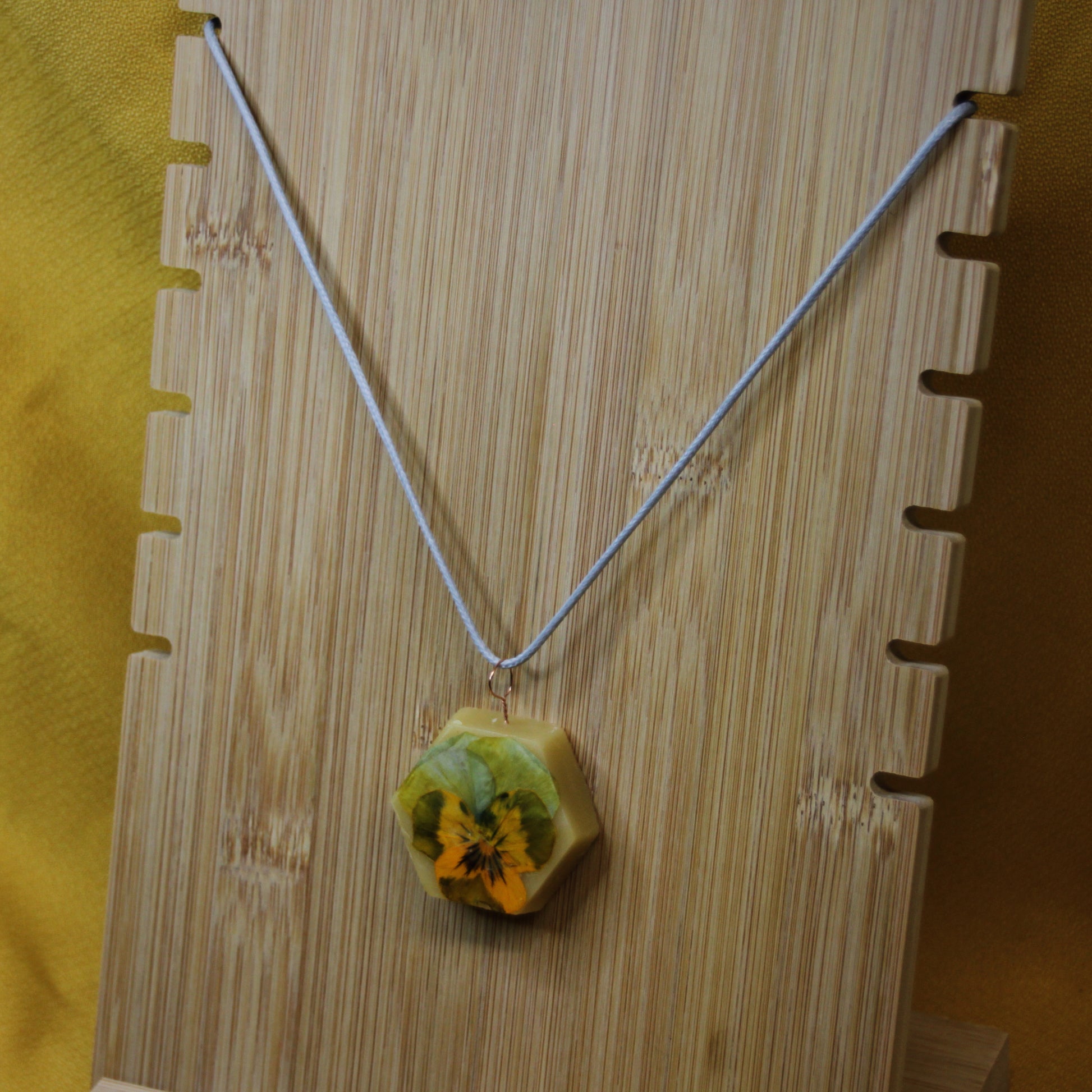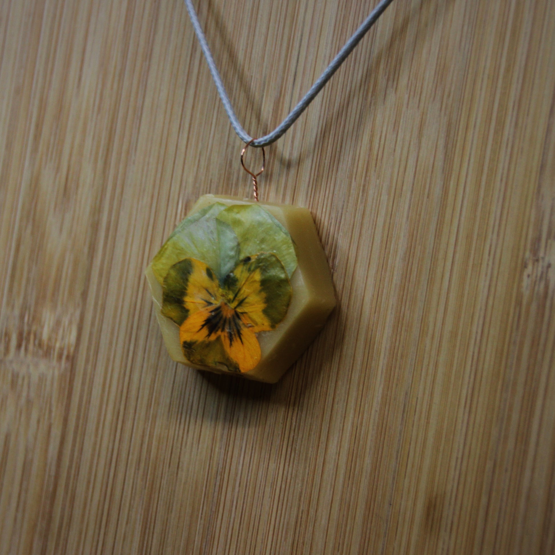 Carry a slice of springtime magic around your neck with this charming beeswax pendant. Featuring a genuine preserved pansy suspended in beeswax, it's like wearing a tiny garden treasure. Strung on soft, colored hemp cord, this lightweight necklace adds natural warmth and a whisper of beeswax fragrance to your day. Perfect for nature lovers who want to keep the beauty of blooming season close at hand, no matter the weather outside.