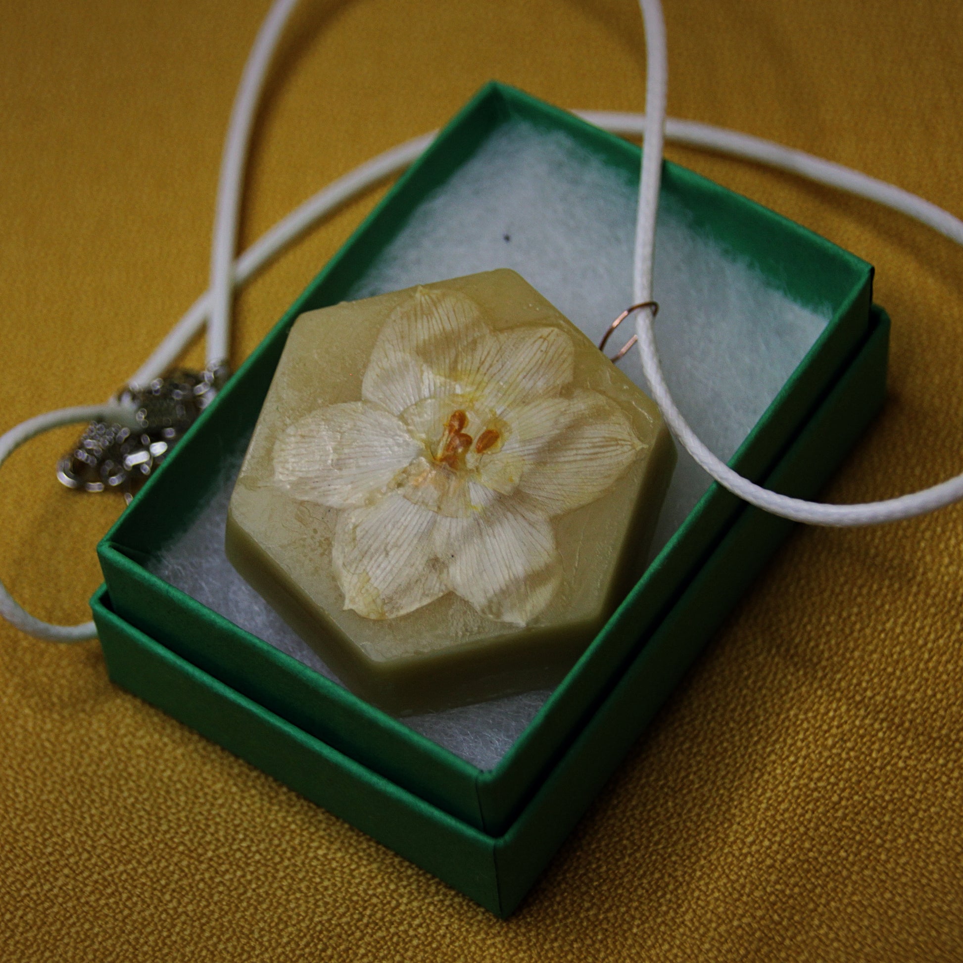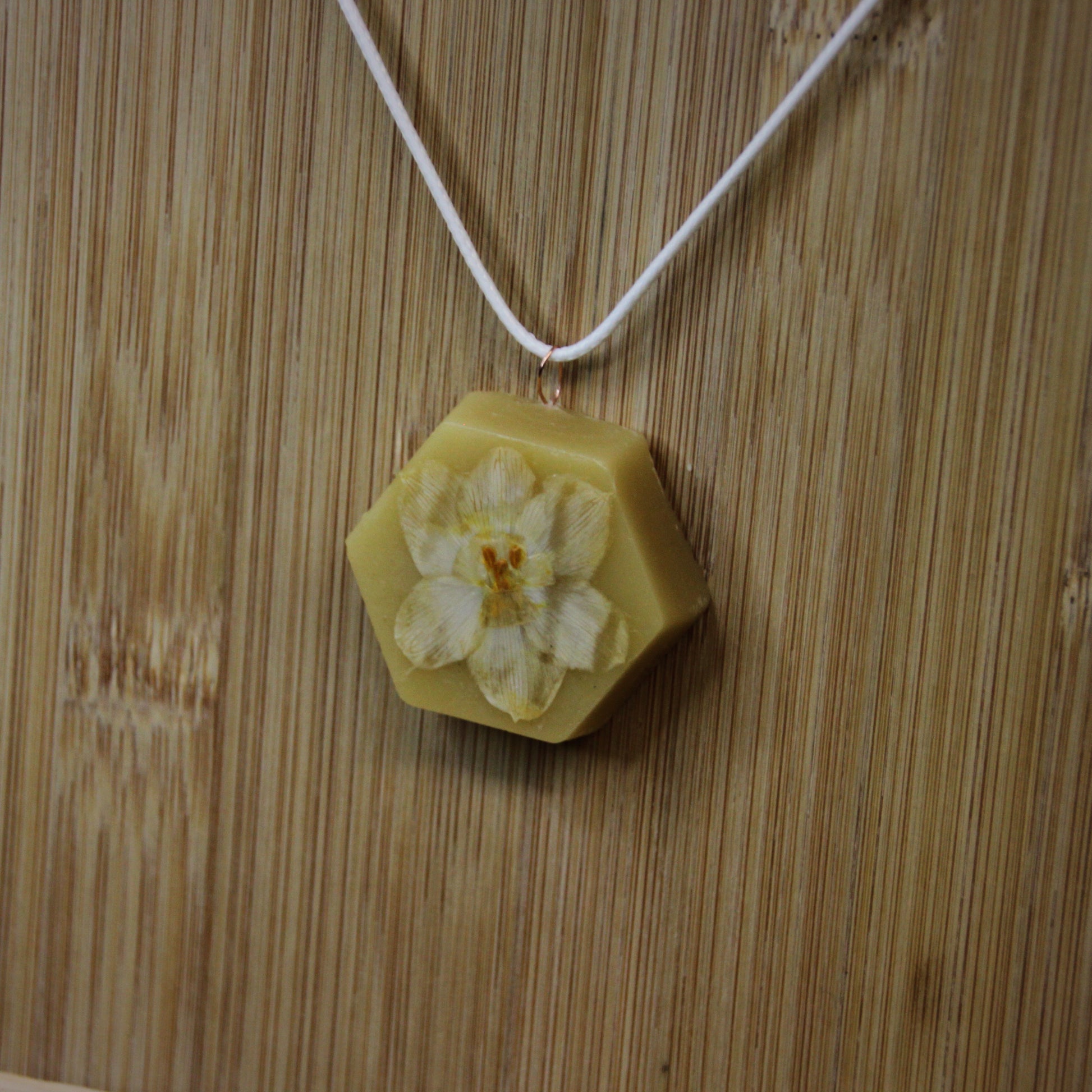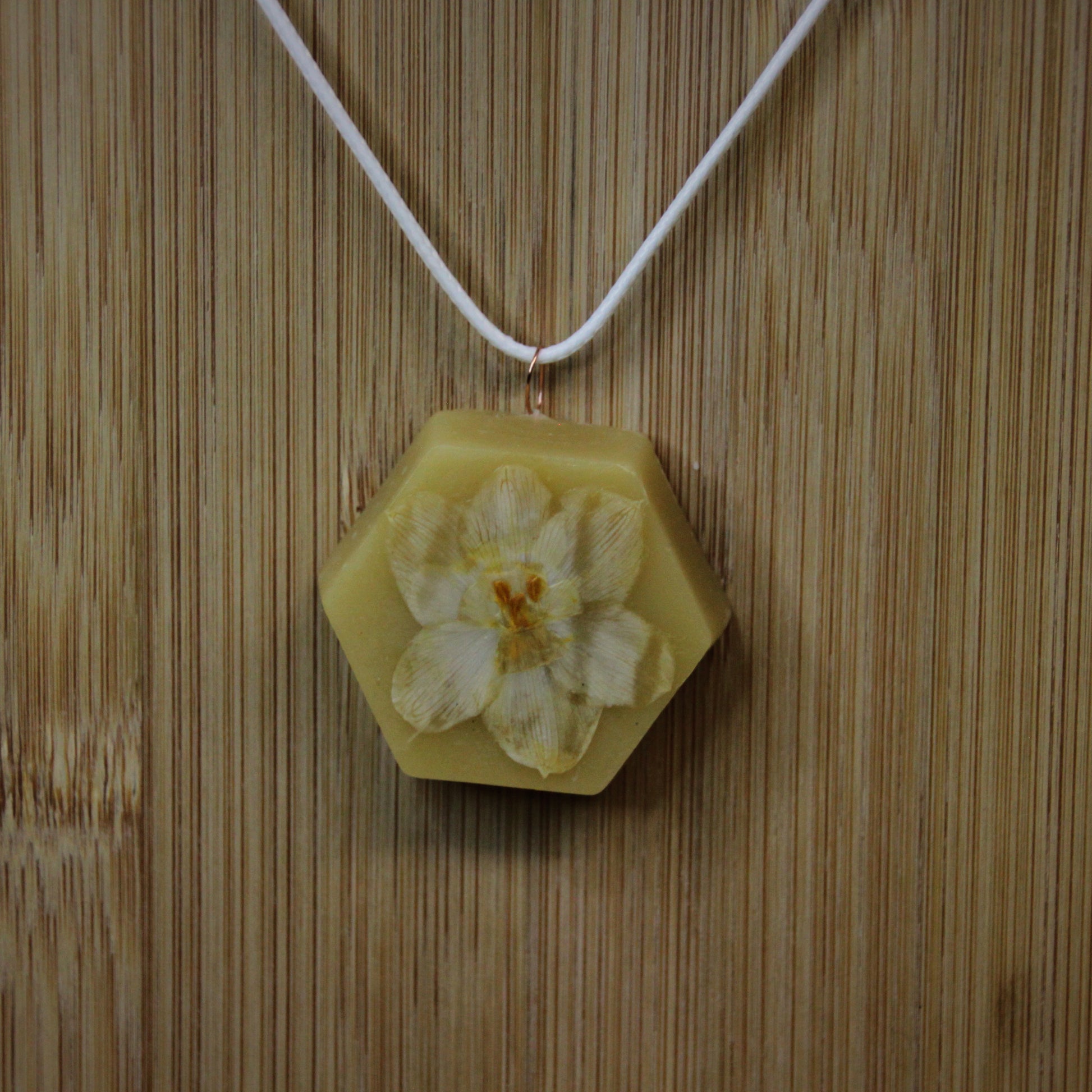 Carry a slice of nature with you in this beeswax-preserved beauty. The delicate paperwhite flower captures the magic of a winter sky—think twinkling star or glistening snowflake. Strung on soft, colored hemp cord and finished with a natural wax coating, this necklace is the perfect treat.