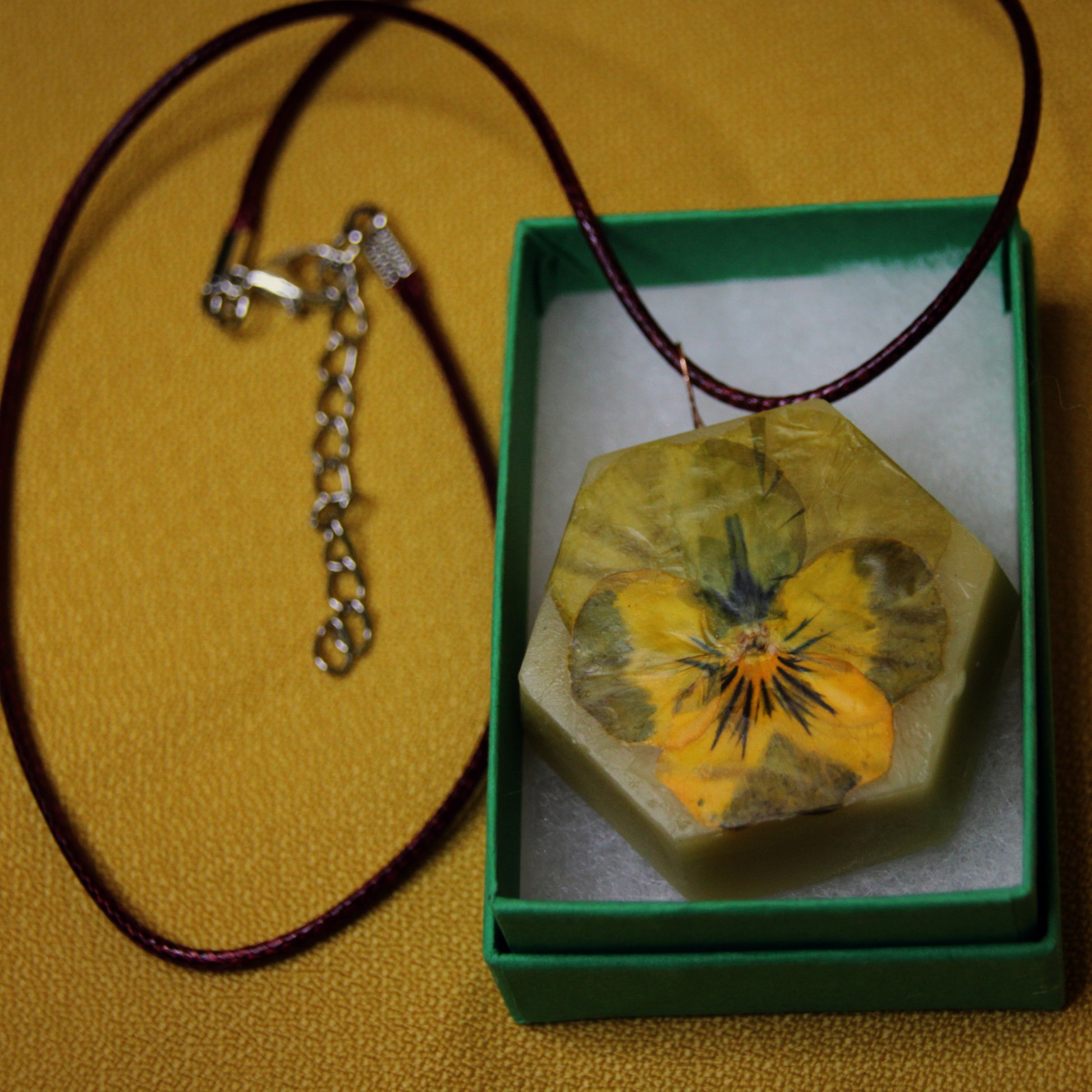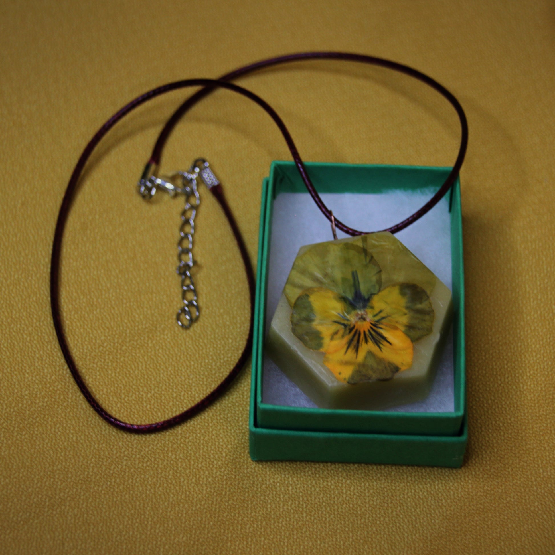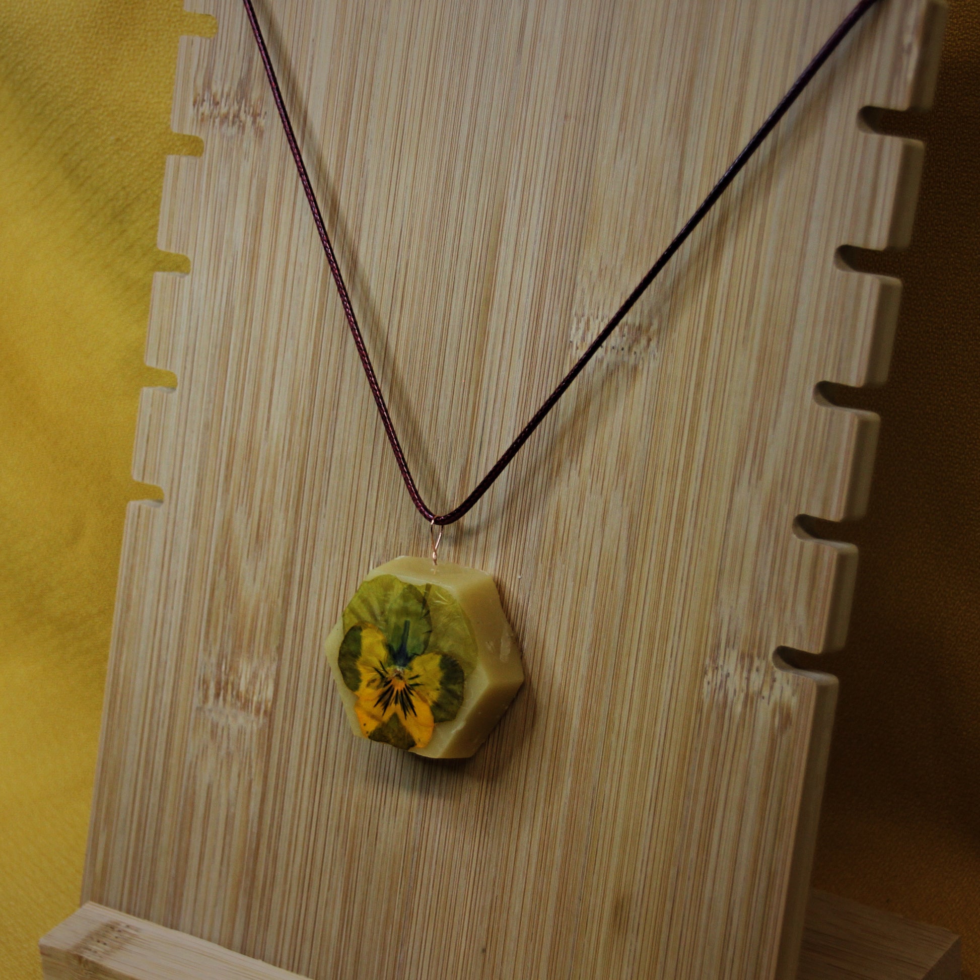 Carry a slice of springtime magic around your neck with this vibrant pansy suspended in pure beeswax. Bold, charming, and impossible to ignore, this statement necklace celebrates nature's beauty in wearable form. Strung on soft, colored hemp cord and infused with the gentle warmth of beeswax, it's the perfect way to keep the garden close—complete with that lovely, subtle honey-like scent that makes every day feel a little more special.